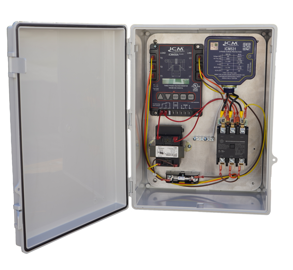 The 3VMS combines the benefits of the ICM450A PLUS+ programmable 3-phase line voltage monitor and a ICM531 type 1 and type 2 three-phase Surge Protective Device (SPD) into one easy-to-install solution. The 3VMS protects against both power surges and over/under voltage issues that can cause damage to circuit boards and motors in residential and commercial three-phase 480VAC HVAC/R equipment.- All Components pre-wired for 480VAC